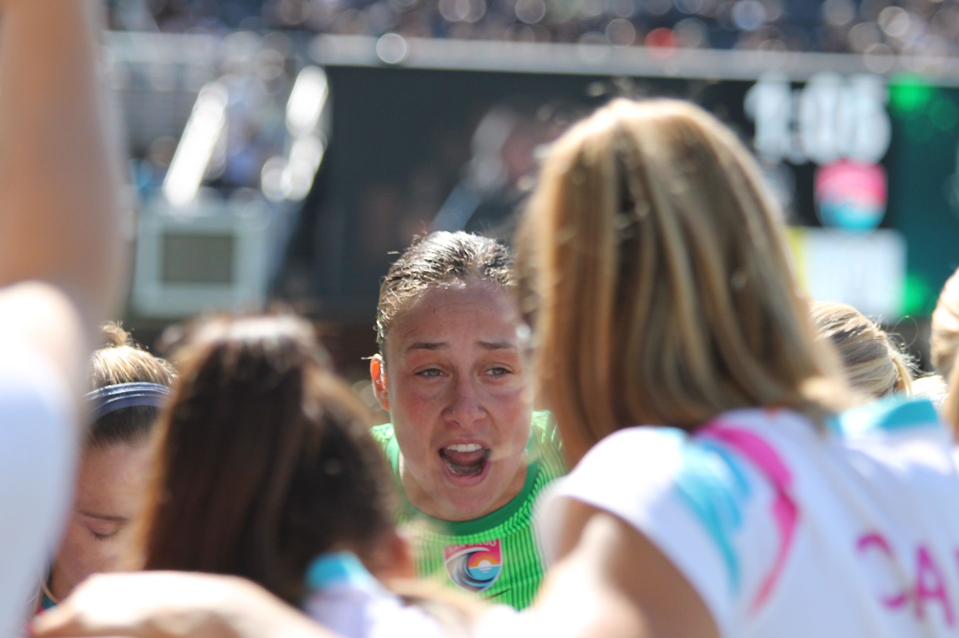 San Diego Wave goalkeeper Kailen Sheridan delivers a pre-game pep talk to her teammates.