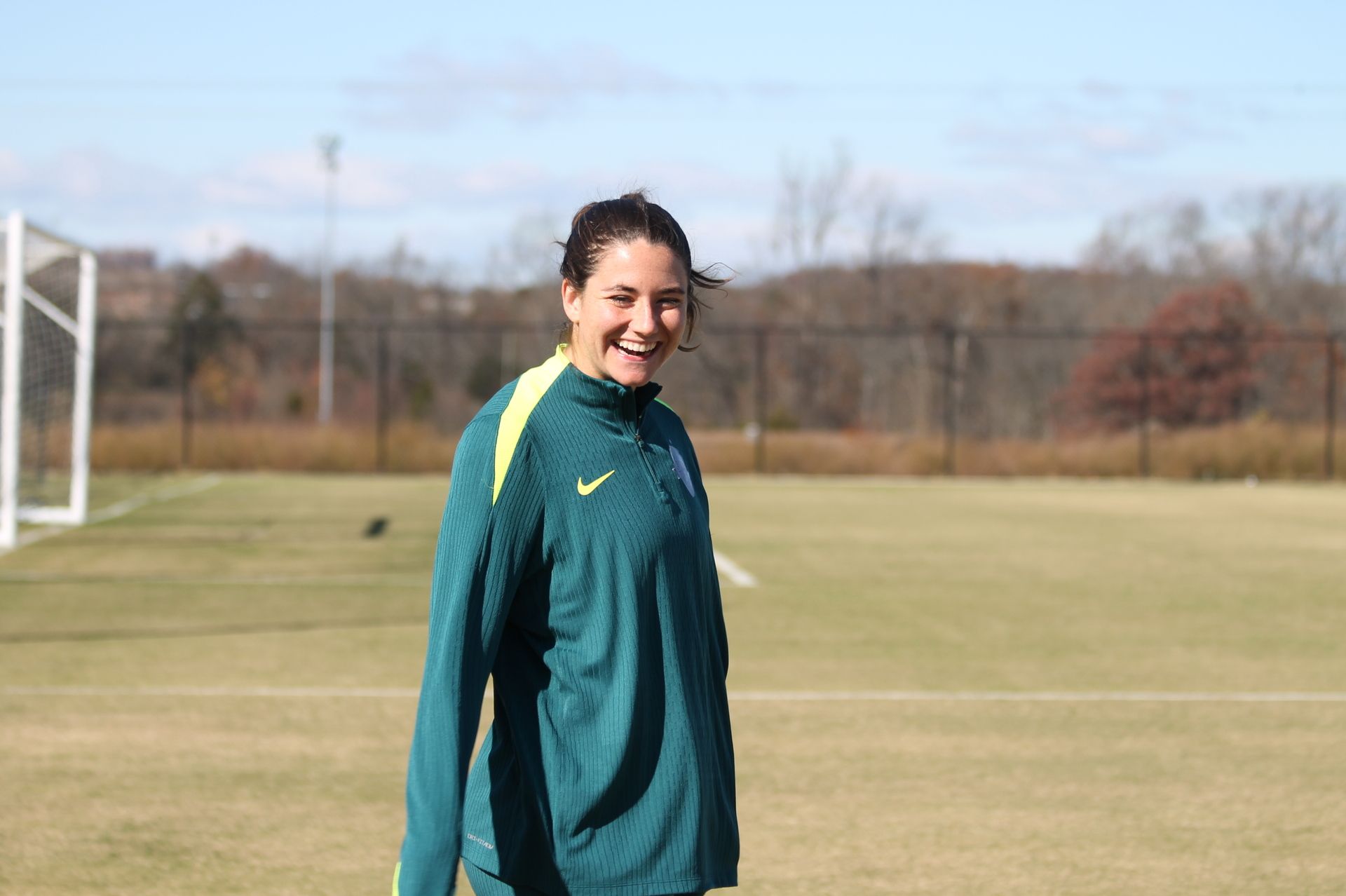 Washington Spirit fullback Kate Wiesner smiles while rocking no coat, just her regular training suit, during a cold training session in Leesburg, VA, November 11, 2025.