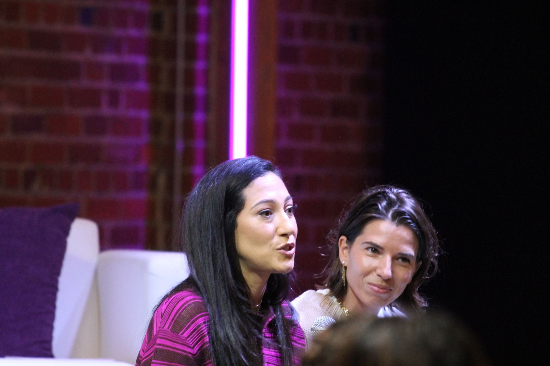 U.S. women’s national team legends and spouses Christen Press (left) and Tobin Heath (right) co-host an episode of their podcast, The RE—CAP Show, at the Ally House activation on November 22, 2025.