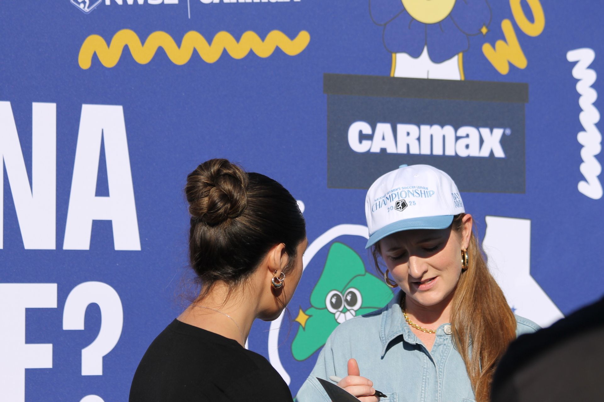 U.S. women’s national team legend Sam Mewis signs an autograph for a fan at the Carmax booth at NWSL Fan Fest on November 22, 2025.