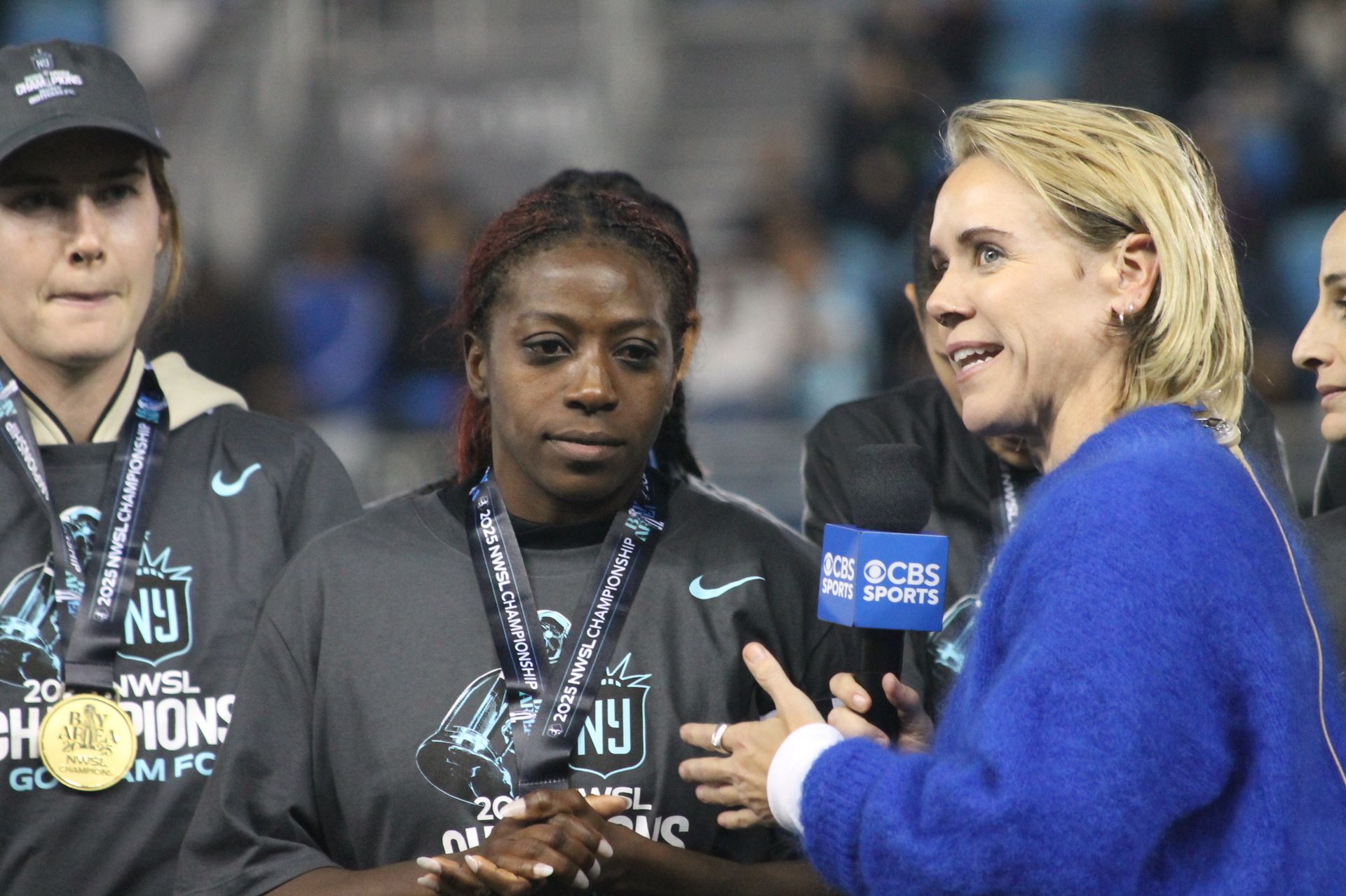 Gotham FC fullback and co-captain Mandy Freeman (center) gets interviewed by Lori Lindsey of CBS Sports (right) after the NWSL Championship game.