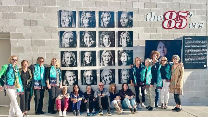 Members of “the 85ers,” the first U.S. women’s national soccer team, pose in front of a commemorative wall of photos installed at CPKC Stadium in Kansas City, Missouri, in 2024. (Image via Pam Cornell)